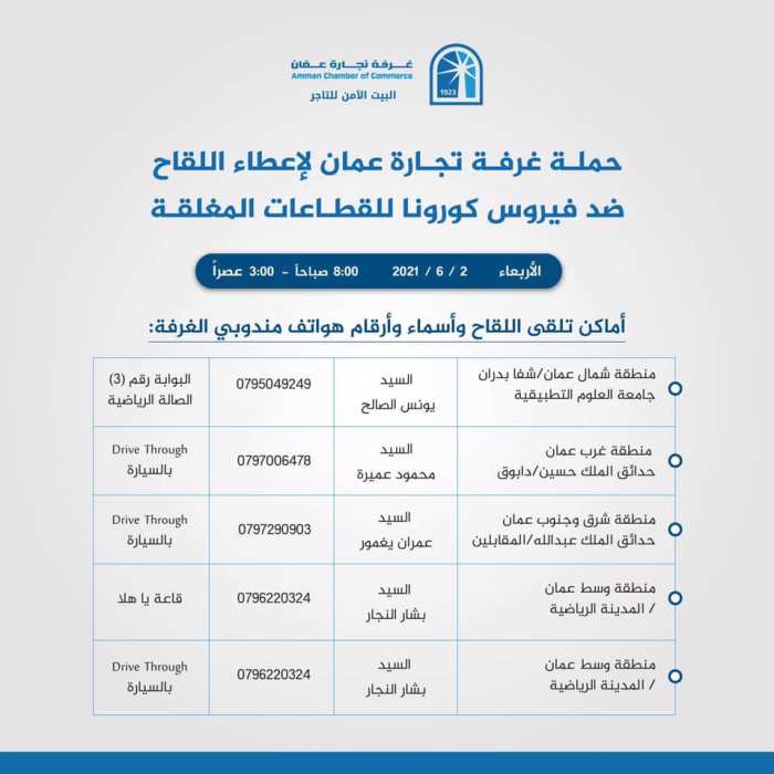 اعلنت غرفة تجارة عمان مساء اليوم الثلاثاء عن الاشخاص الذين يحق لهم تلقي مطعوم مضاد لكورونا من التجار واصحاب الاعمال واماكن تلقي اللقاح ضمن حملة غرفة تجارة عمان الخاصة بتطعيم اصحاب الاعمال والعاملين لديهم للمنشآت ضمن فئة القطاعات المغلقة :