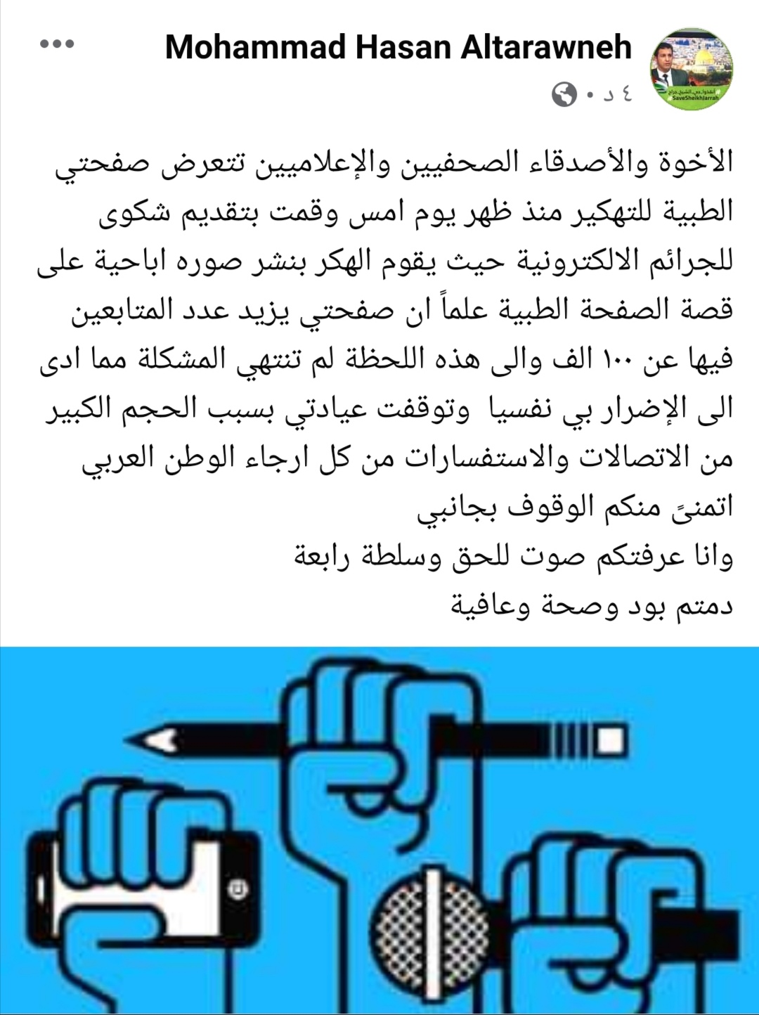 الأخوة والأصدقاء الصحفيين والإعلاميين تتعرض صفحتي الطبية للتهكير منذ ظهر يوم امس وقمت بتقديم شكوى للجرائم الالكترونية حيث يقوم الهكر بنشر صوره اباحية على قصة الصفحة الطبية علماً ان صفحتي يزيد عدد المتابعين فيها عن ١٠٠ الف والى هذه اللحظة لم تنتهي المشكلة مما ادى الى الإضرار بي نفسيا وتوقفت عيادتي بسبب الحجم الكبير من الاتصالات والاستفسارات من كل ارجاء الوطن العربي