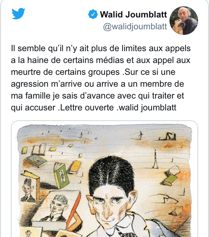 غرد رئيس الحزب التقدمي الاشتراكي وليد جنبلاط في حسابه قائلاً: "يبدو أنه لم تعد هناك حدود لدعوات الكراهية لبعض وسائل الإعلام والدعوات لقتل مجموعات معينة. بناء عليه في حال حدث لي أي مكروه أو لأحد أفراد عائلتي، أصبحت مسبقاً أعرف مع من أتعامل ومن أتهم. رسالة مفتوحة".