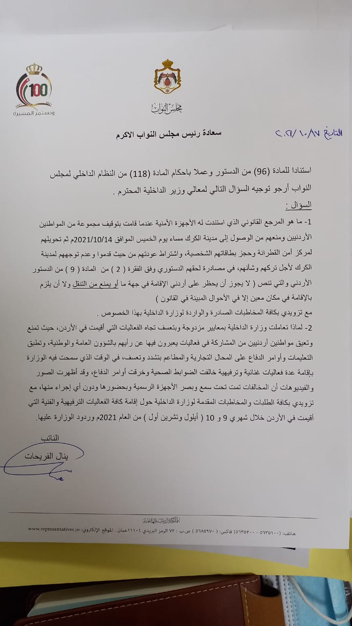1- ما هو المرجع القانوني الذي استندت له الأجهزة الأمنية عندما قامت بتوقيف مجموعة من المواطنين الأردنيين ومنعهم من الوصول إلى مدينة الكرك مساء يوم الخميس الموافق 14/10/2021م ثم تحويلهم لمركز أمن القطرانة وحجز بطاقاتهم الشخصية، واشتراط عودتهم من حيث قدموا وعدم توجههم لمدينة الكرك لأجل تركهم وشأنهم، في مصادرة لحقهم الدستوري وفق الفقرة ( 2 ) من المادة ( 9 ) من الدستور الأردني والتي تنص ( لا يجوز أن يحظر على أردني الإقامة في جهة ما أو يمنع من التنقل ولا أن يلزم بالإقامة في مكان معين إلا في الأحوال المبينة في القانون ) مع تزويدي بكافة المخاطبات الصادرة والواردة لوزارة الداخلية بهذا الخصوص .