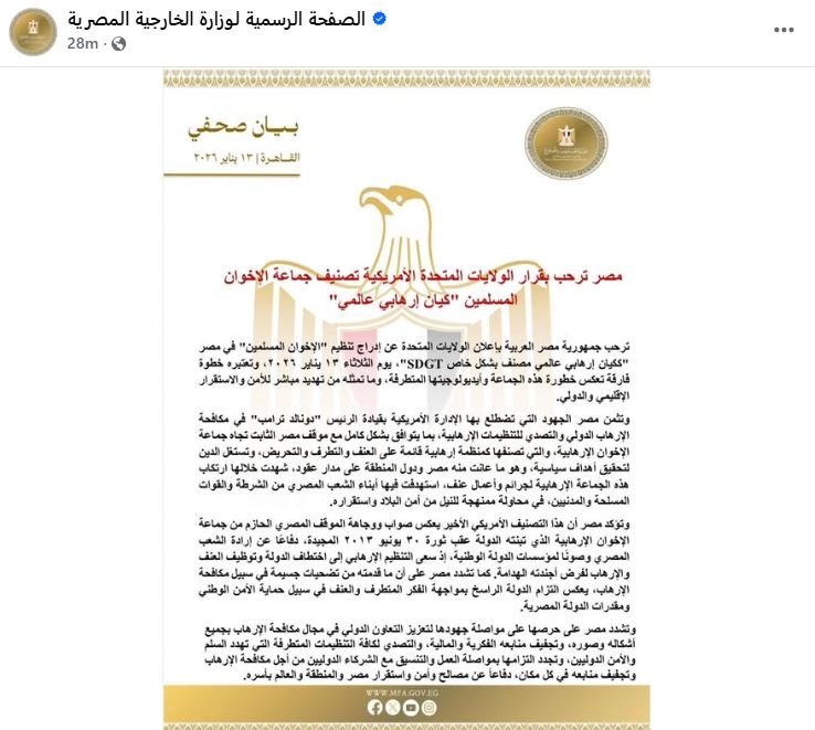 مصر ترحب بالقرار الأمريكي تصنيف فرع تنظيم "الإخوان" في مصر “منظمة إرهابية عالمية