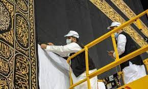 رفع الجزء السفلي من كسوة الكعبة المشرفة للحفاظ على نظافتها