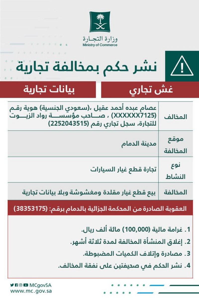 "التجارة السعودية" تشهِّر بصاحب مؤسسة زورت بلد المنشأ لقطع غيار السيارات