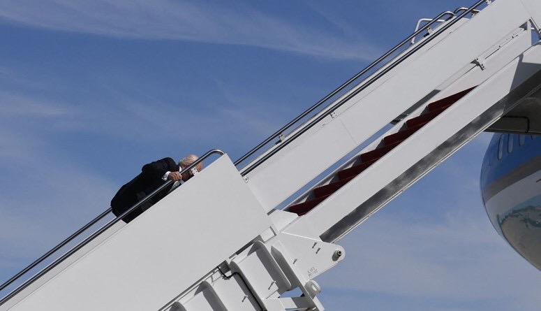 شاهد ... بايدن يتعثر مرتين ويسقط على ركبته خلال صعوده إلى الطائرة