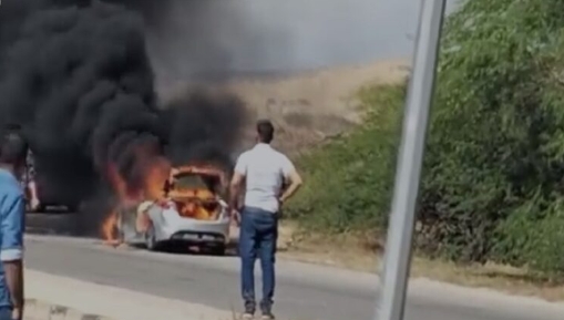سيارة تتعرض للاحتراق بالكامل على طريق البحر الميت
