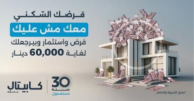 كابيتال بنك يطلق حملة استثنائية لقروض الإسكان مصحوبة بخطة استثمارية تمنح العملاء عائداً مالياً يصل إلى 60 ألف دينار في نهاية عمر القرض