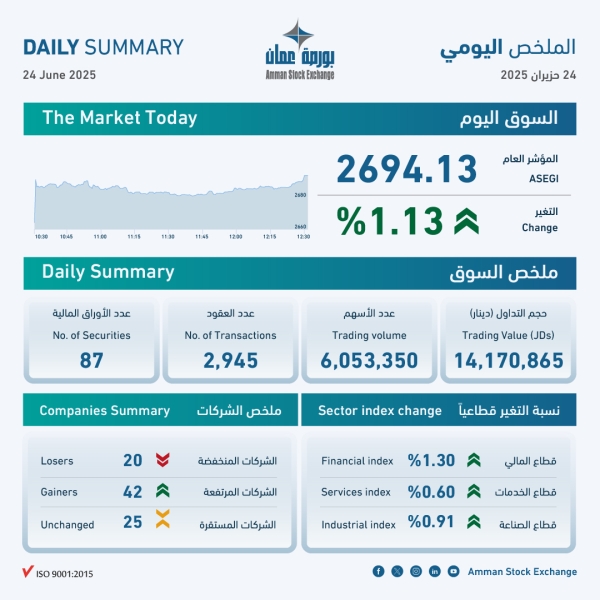 بورصة عمان تغلق تداولاتها على ارتفاع