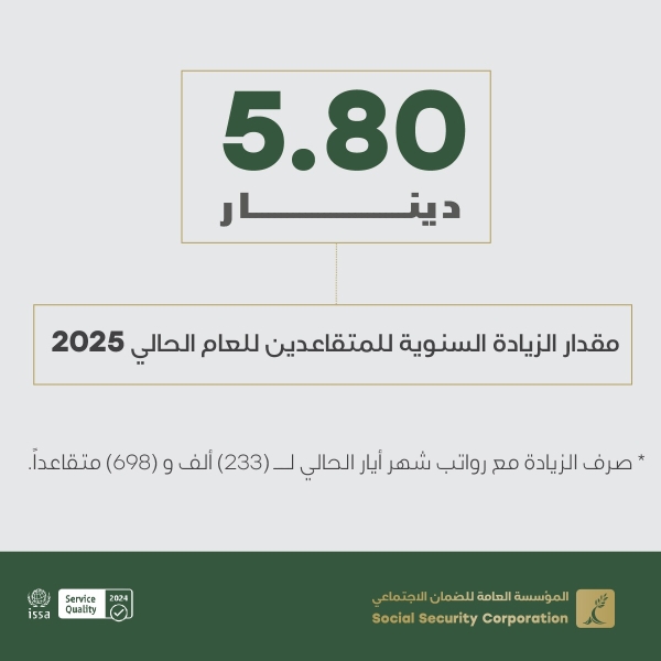 الضمان الاجتماعي: خمسة دنانير وثمانون قرشاً مقدار الزيادة السنوية للمتقاعدين