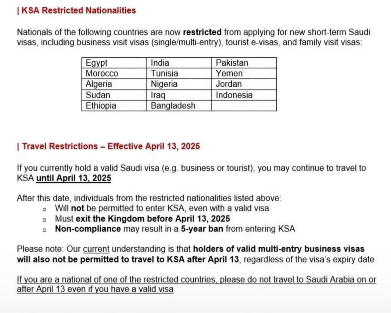 عاجل - بما فيها الأردن …. السعودية تقيد إصدار التأشيرات لـ14 دولة اعتبارًا من 13- نيسان - 2025