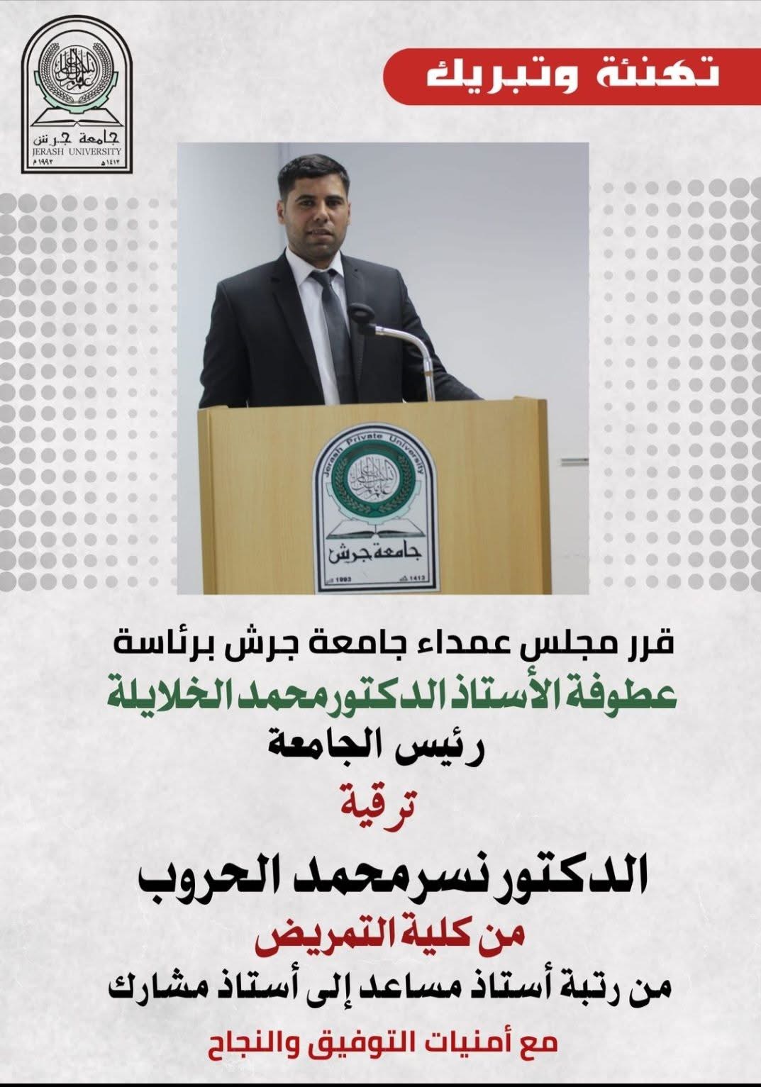 جامعة جرش تُرقّي الدكتور نسر الحروب إلى أستاذ مشارك