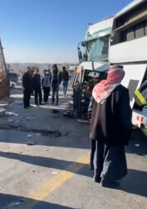 حادث تصادم بين حافلة وتريلا يتسبب بإغلاق طريق الـ100