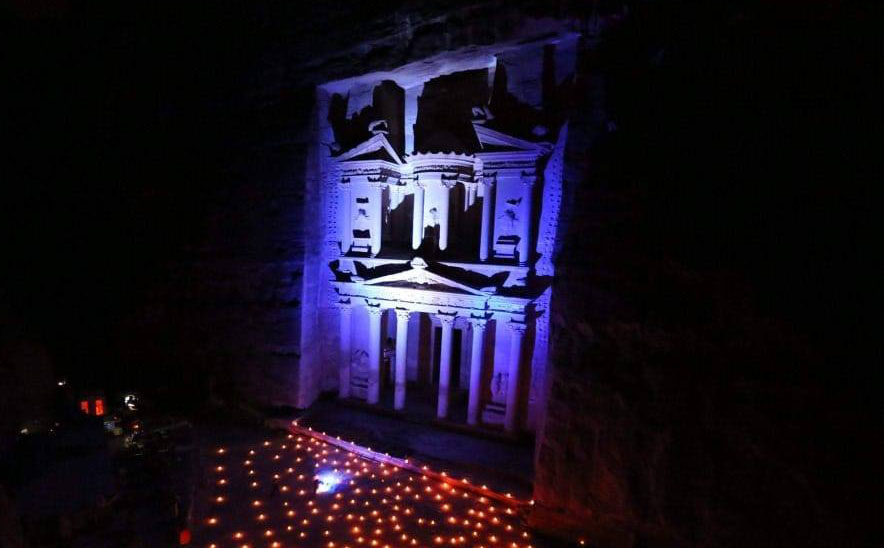 إضاءة الخزنة في المدينة الوردية باللونين الأصفر والأزرق