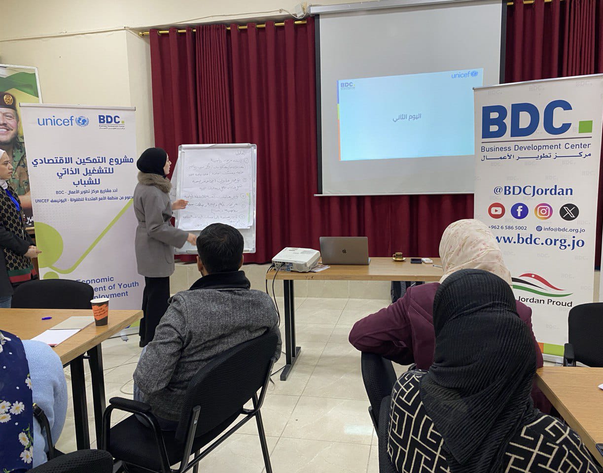 برنامج التمكين الإقتصادي احد برامج مركز تطوير الاعمال BDC المدعوم من اليونيسف يعقد ورشه تمكين وبناء قدرات للشباب في معان.
