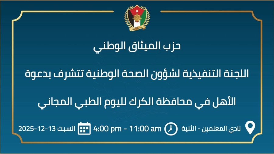 حزب الميثاق الوطني يدعو أهالي الكرك ليوم طبي مجاني شامل