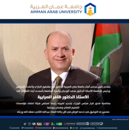 جامعة عمان العربية تهنئ عطوفة الاستاذ الدكتور ظافر الصرايرة