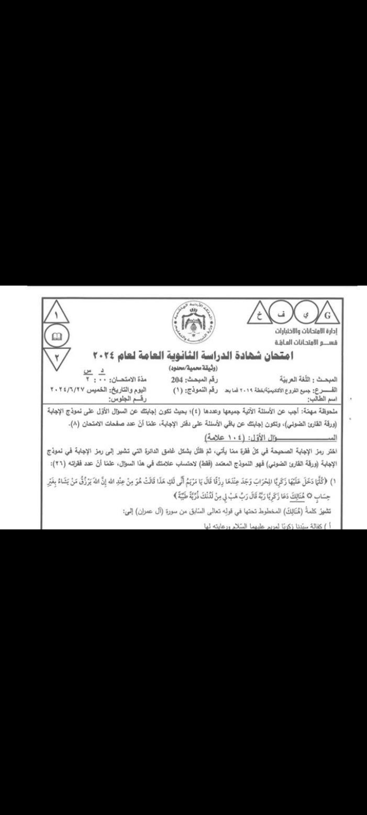 عاجل /التربية تنشر أسئلة امتحان التوجيهي لمبحث اللغة العربية