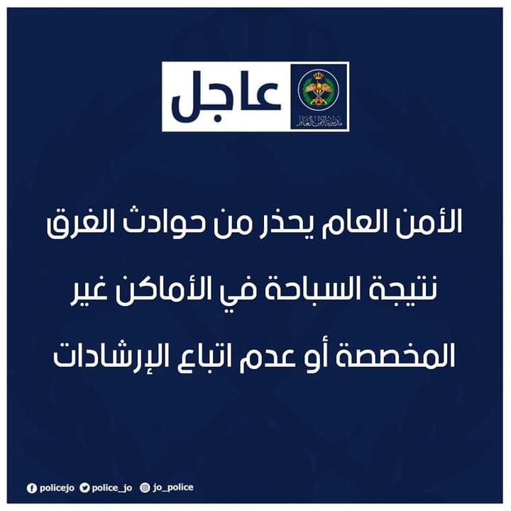 الأمن العام يحذر من حوادث الغرق نتيجة السباحة في الأماكن غير المخصصة أو عدم اتباع الإرشادات