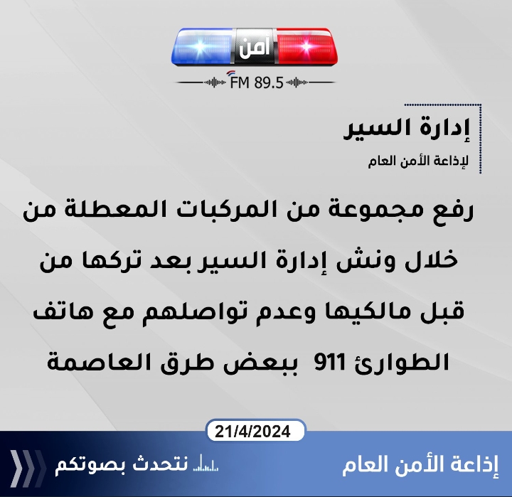 #عاجل رفع مجموعة من المركبات المعطلة من خلال ونش إدارة السير بعد تركها من قبل مالكيها وعدم تواصلهم مع هاتف الطوارئ 911 ببعض طرق العاصمة