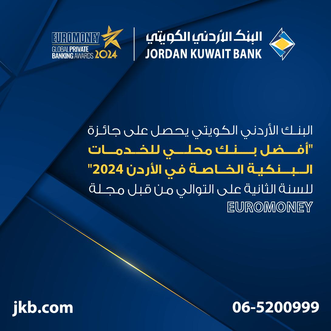 للعام الثاني على التوالي، البنك الأردني الكويتي يحصل على جائزة " أفضل بنك محلي للخدمات المصرفية الخاصة في الأردن 2024 " من EUROMONEY العالمية