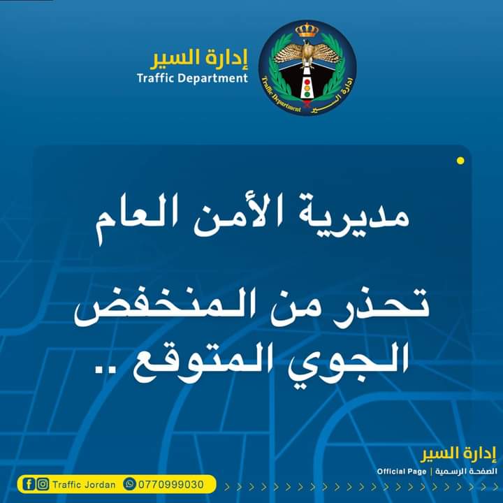 أكدت مديرية الأمن العام على ضرورة الالتزام بالسلوك الآمن خلال المنخفض الجوي المتوقع بدء تأثيره على المملكة اليوم