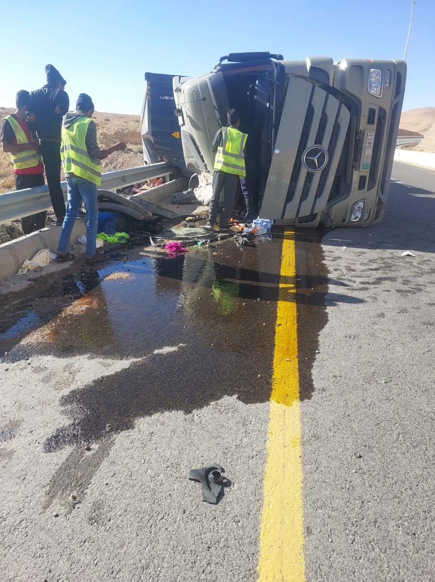 الأشغال بالتعاون مع الأمن العام يعيدان حركة المرور إلى وضعها الطبيعي بعد انقلاب شاحنة على طريق النقب