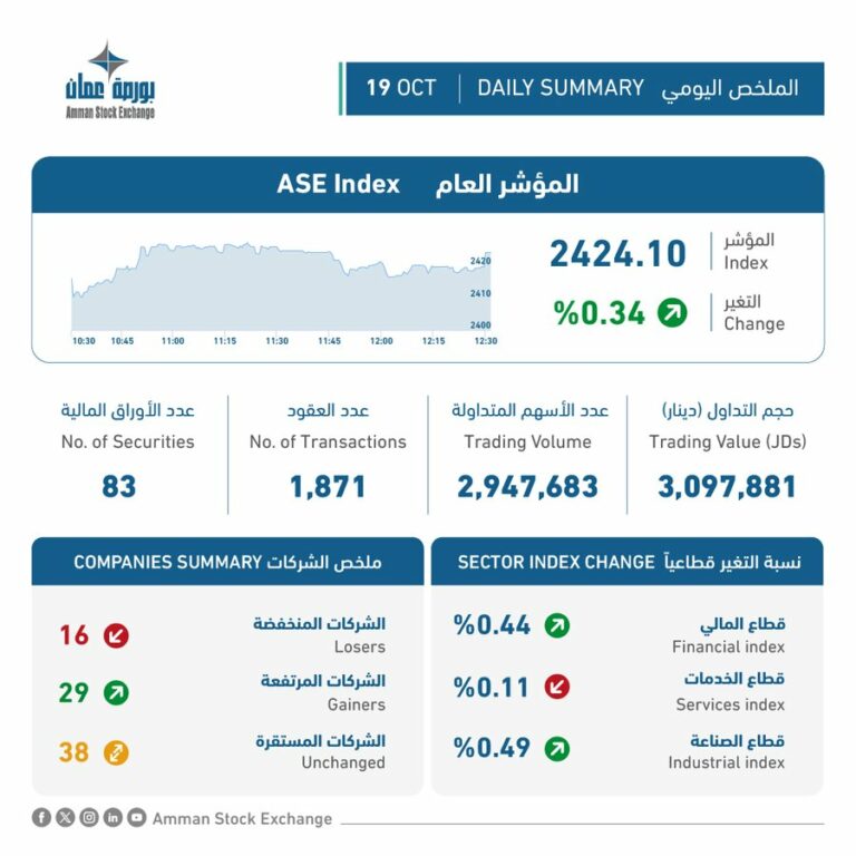 ارتفاع الرقم القياسي لبورصة عمان الى “2424.10” نقطة
