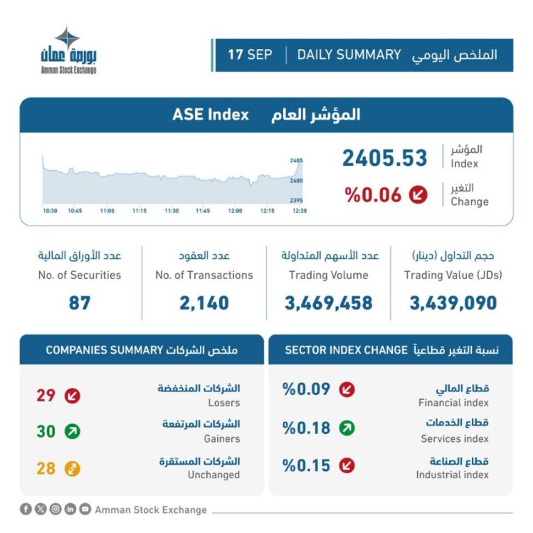 انخفاض الرقم القياسي لبورصة عمان إلى “2405.53” نقطة
