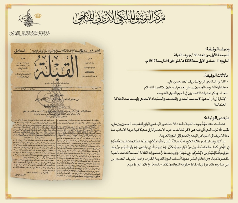 التوثيق الملكي يعرض وثيقة بمناسبة ذكرى الثورة العربية الكبرى