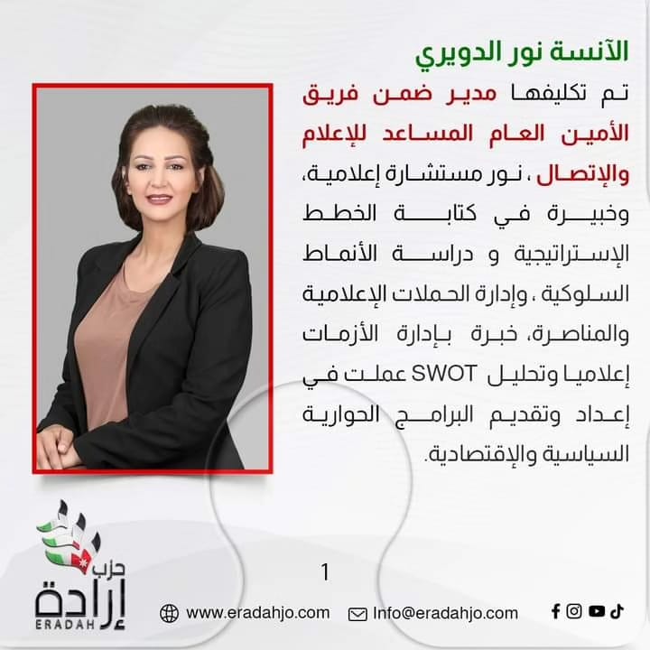 تكليف نور الدويري مديراً تنفيذياً للإعلام وإدارة المحتوى في حزب إرادة