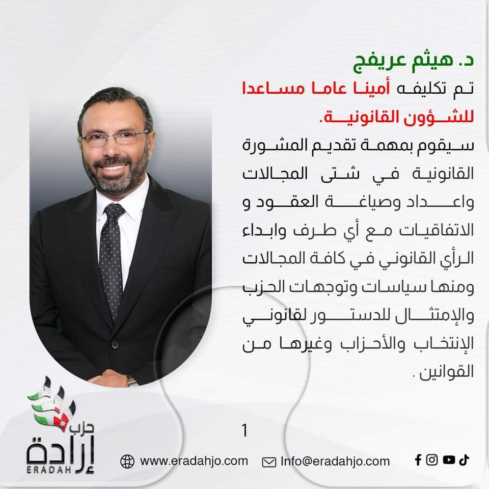 عريفج امينا عاما مساعدا للشؤون القانونية في حزب ارادة