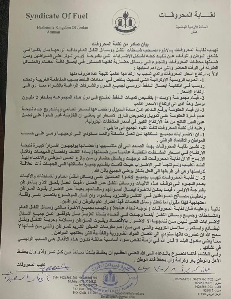 عاجل / نقابة المحروقات تناشد مـالكي وسائل النقـل الـعـام والشاحنات بوقف الاضرابات