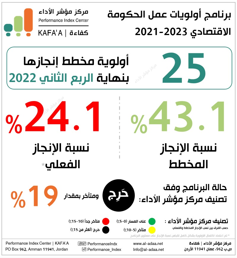 عاجل / مركز مؤشر الأداء: برنامج أولويات عمل الحكومة بالمستوى الحرج ونسبة التأخر19%