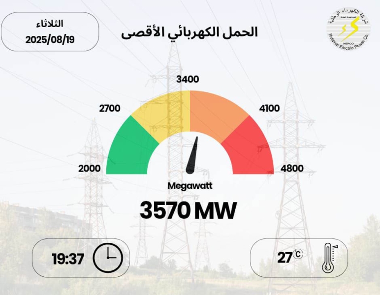 3570 ميجا واط الحمل الكهربائي الأقصى المسجل اليوم