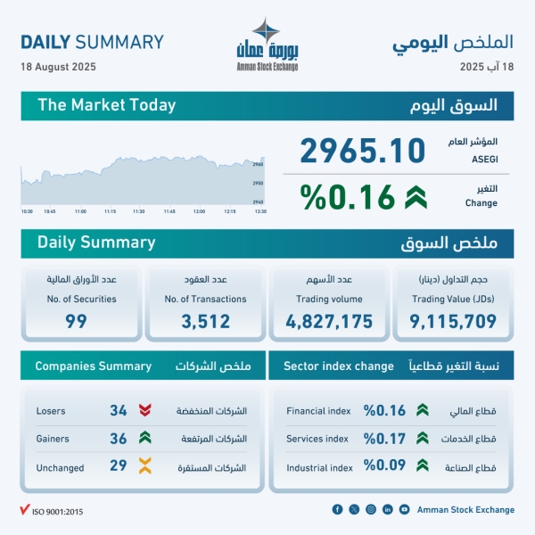 9.1 مليون دينار حجم التداول في بورصة عمان