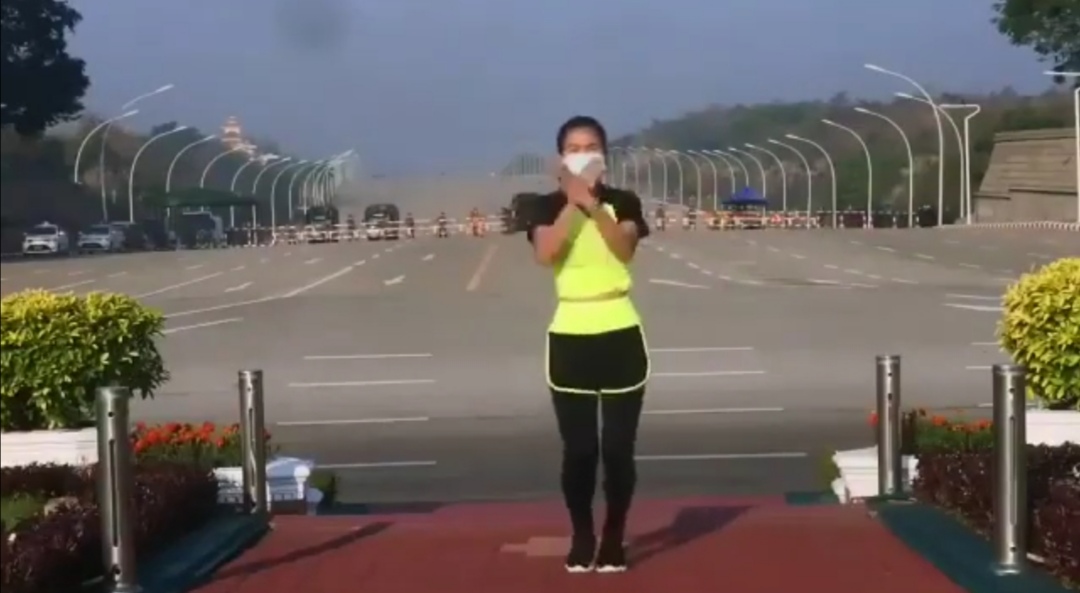 سوشيال ميديا:ميانمار .. فتاة تؤدي وصلة تمارين راقصة في الشارع غير عابئة بمجريات الانقلاب (فيديو)