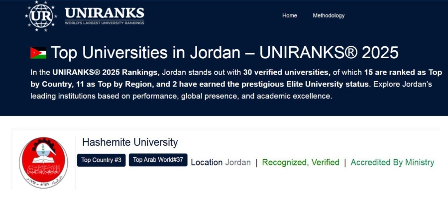 الجامعة الهاشمية في المركز الثالث محليًّا و37 عربيّاً في تصنيف UNIRANKS العالمي لعام 2025
