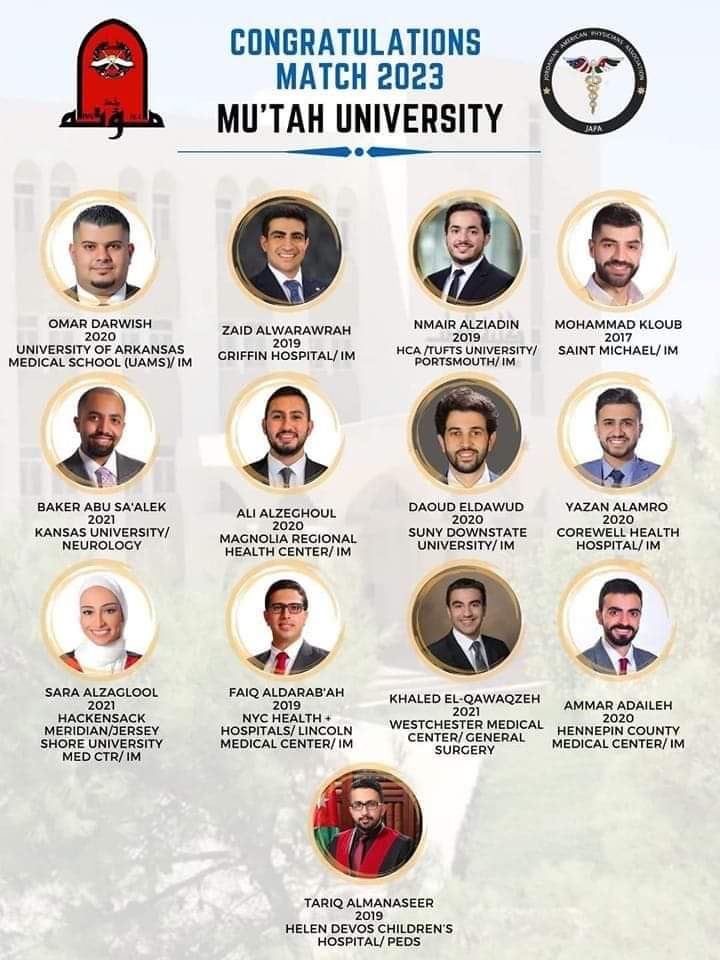 جامعة مؤتة : 13 طبيب من خريجو كلية الطب في جامعة مؤتة يحصلون على مقاعد إقامة في الولايات المتحدة
